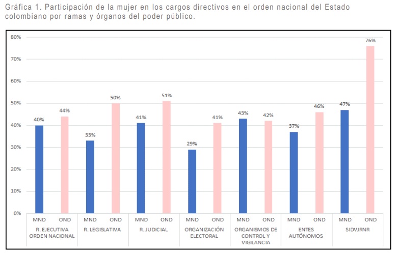 En los OND de la Rama Ejecutiva las mujeres ocupan el 44% de los puestos; en la Rama Legislativa 50% y en la Rama Judicial el 51%. La Organización Nacional Electoral el 41%; en los organismos de control y vigilancia el 42%; entes autónomos, 46% y en el Sistema Integral de Verdad, Justicia, Reparación y No Repetición la participación es del 76%.