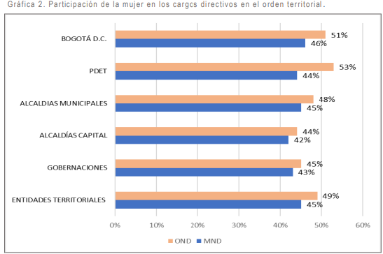 En el orden territorial, Bogotá, D.C. también arrojó niveles altos de participación de las mujeres en los cargos de máximo de nivel decisorio con un 46%; así como en las alcaldías de ciudades capitales (42%) y las gobernaciones (43%).