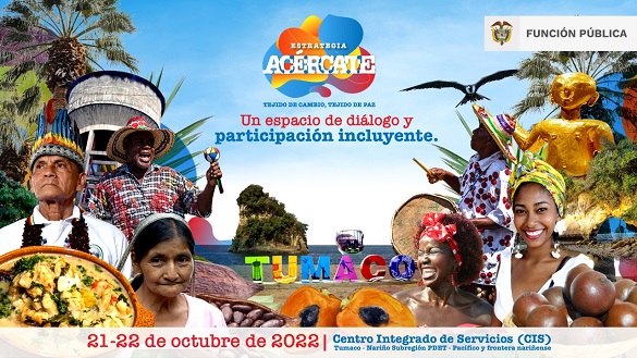Bogotá, 12 de octubre de 2022.- Función Pública llega este viernes 21 y sábado 22 de octubre al municipio de Tumaco, Nariño con la Estrategia Acércate, un espacio de diálogo y participación incluyente donde los protagonistas son los habitantes de Tumaco, la subregión del Pacífico y Frontera Nariñense.