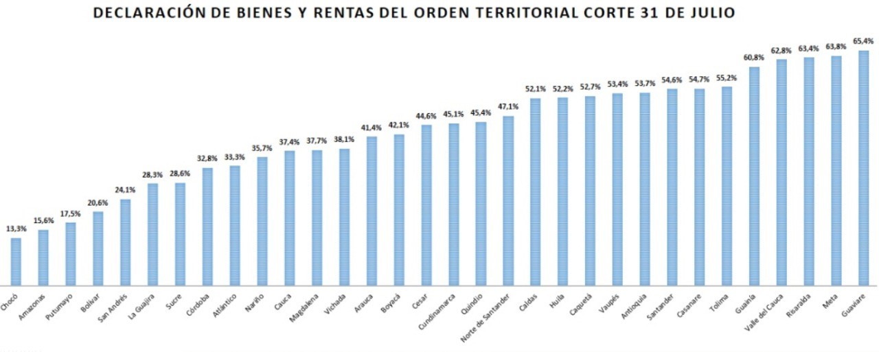 “Hacemos un llamado a las entidades de los departamentos de Chocó, Amazonas, Putumayo y Bolívar, quienes tuvieron un bajo porcentaje de cumplimiento en las declaraciones de bienes y rentas de sus servidores en el aplicativo. No hacer esta declaración puede llevar a sanciones a los servidores por su incumplimiento”, puntualizó el director Fernando Grillo.