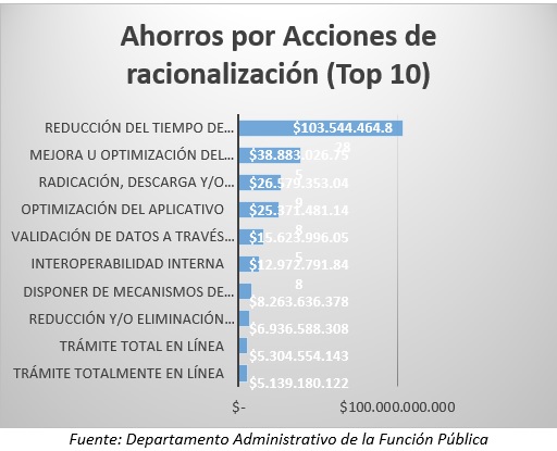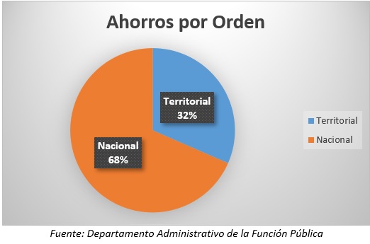 El balance reportado por el Departamento Administrativo de la Función Pública muestra que de los $31.486 millones que se han generado en ahorros a los colombianos durante el 2021, el 74% corresponde a acciones que se han realizado en entidades del Orden Nacional y 26% son de intervenciones hechas en las entidades del Orden Territorial (ver cuadro).