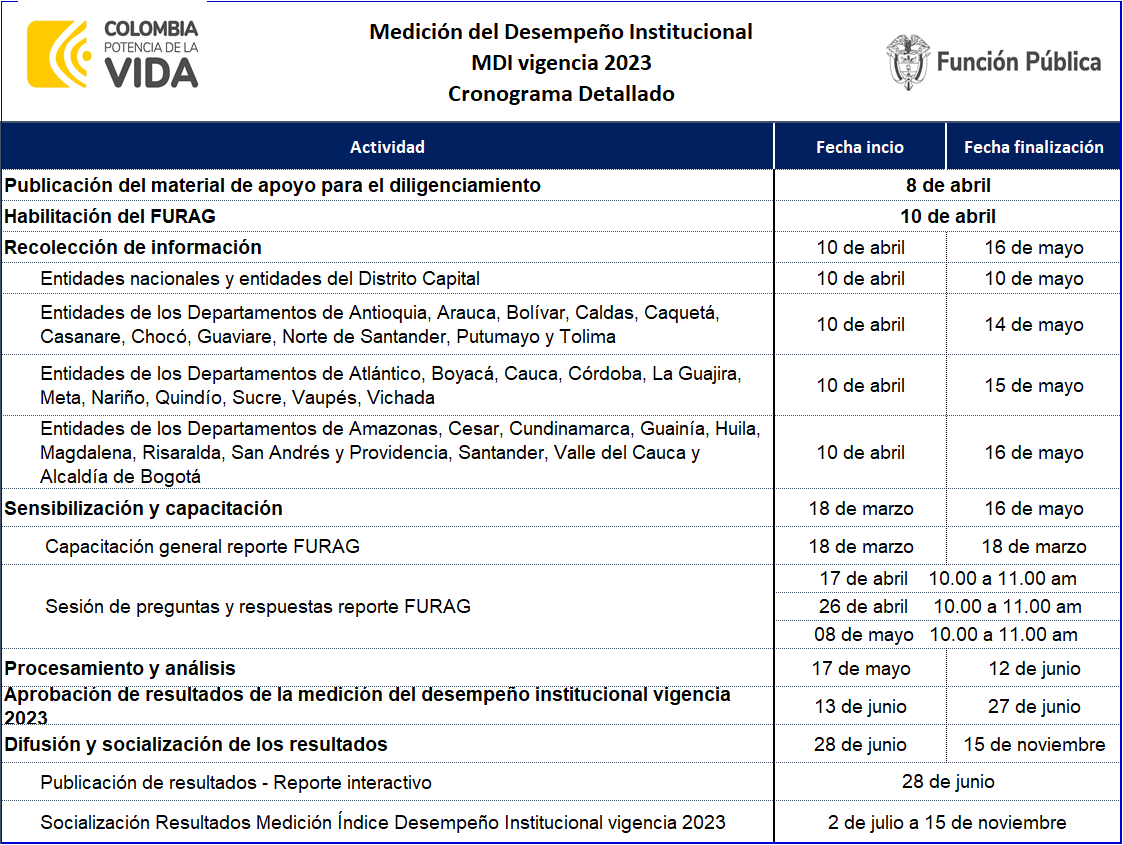 - La Medición de la Gestión y Desempeño Institucional en Colombia se hace a través del Formulario Único de Reporte y Avance de Gestión (FURAG), aplicativo que será habilitado este 10 de abril y cierra en mayo del 2024, para cada departamento la fecha de cierre es diferente.