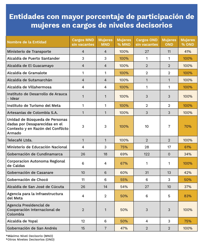 Estas mismas entidades junto con otras, como Artesanías de Colombia, la Agencia Presidencial de Cooperación Internacional de Colombia; la Agencia para la Infraestructura del Meta y la Unidad de Búsqueda de Personas dadas por Desaparecidas en el Contexto y en Razón del Conflicto Armado también muestran cifras relevantes de mujeres en cargos de otros niveles decisorios (OND).