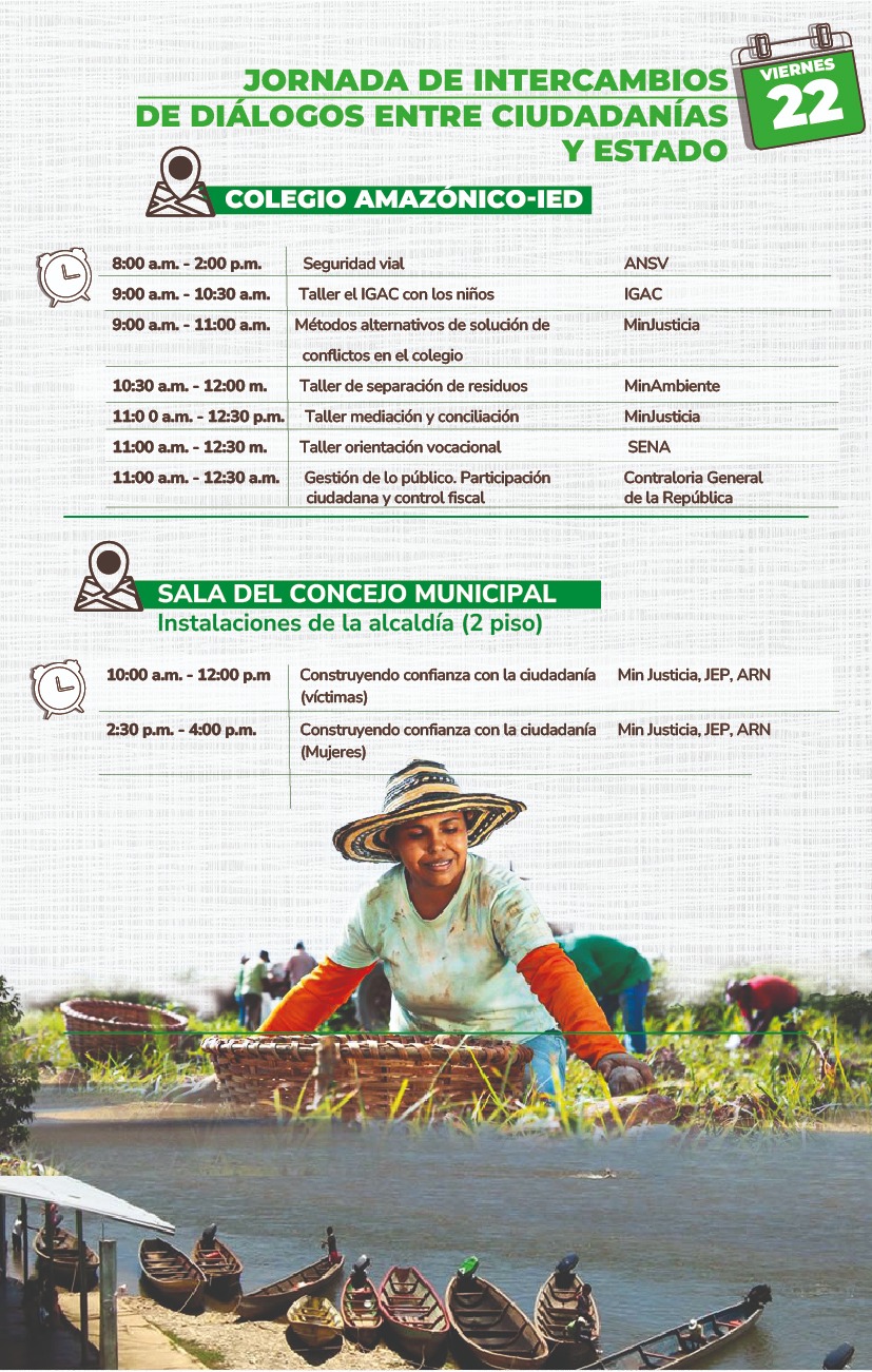 Adicionalmente, las 40 entidades participantes brindarán información, atención a trámites y capacitaciones en temas relacionados con la restitución de tierras, atención a víctimas del conflicto armado, formalización minera, atención a primera infancia, apoyo a proyectos productivos, tránsito a la formalización laboral y la economía legal, acceso a educación y salud, buenas prácticas ambientales y afiliación a pensión, entre otros temas que son fundamentales en Puerto Guzmán.