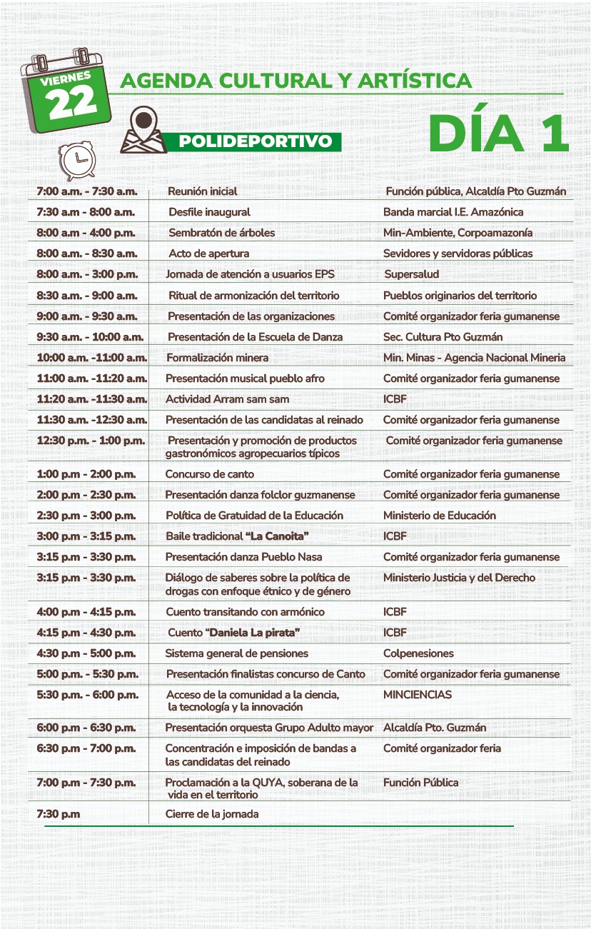 Al evento, que se llevará a cabo desde las 8 de la mañana en el Coliseo Cubierto del barrio Jardín de Puerto Guzmán, está dirigido también a las comunidades del alto y medio Putumayo de municipios como Puerto Asís, Puerto Caicedo, Villagarzón, San Francisco y Mocoa, además del pueblo Nasa de este territorio.