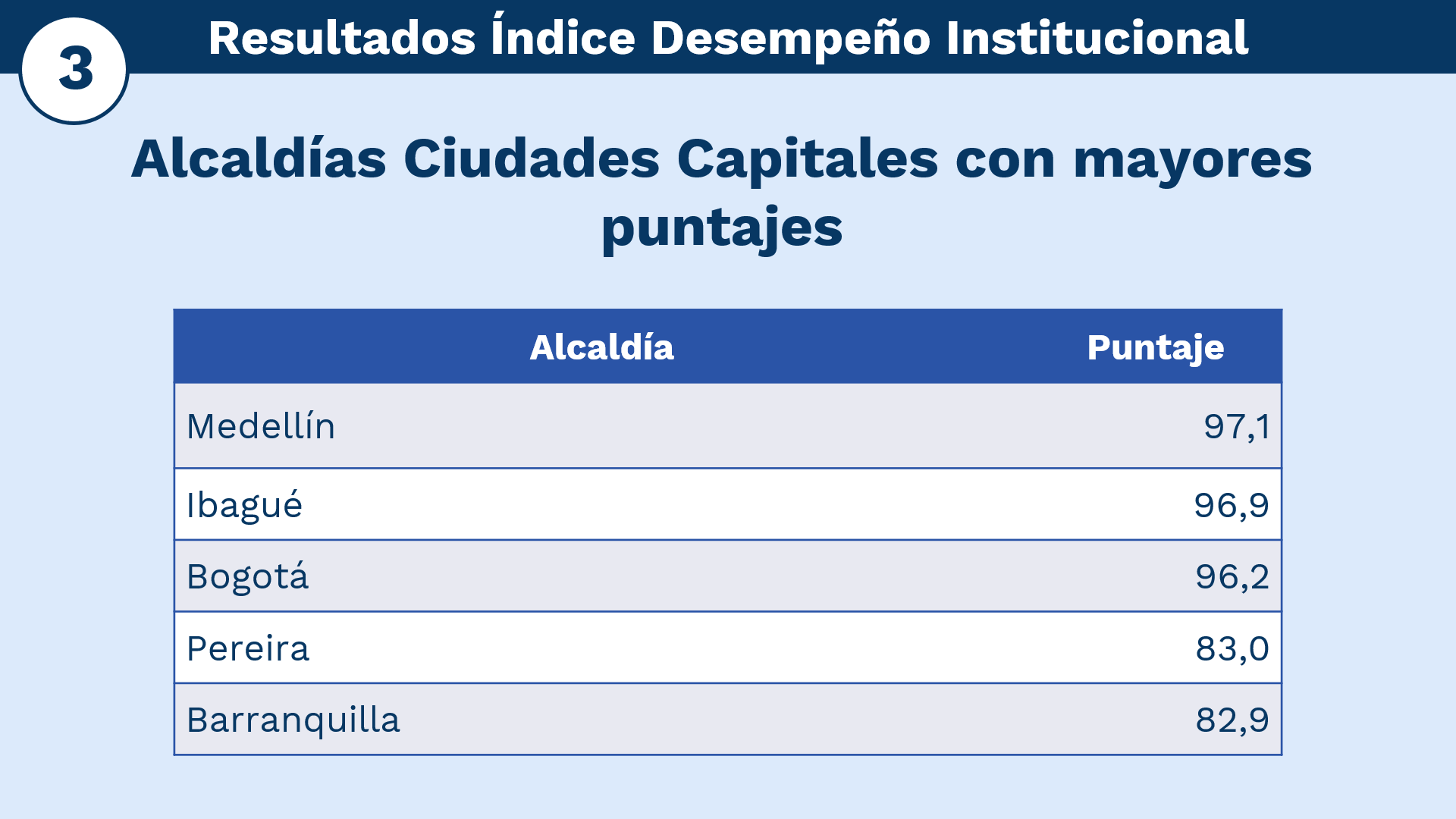 Las Alcaldías de Ciudades Capitales que se destacaron en la medición fueron Medellín, Ibagué, Bogotá, Pereira y Barranquilla (Ver Cuadro)