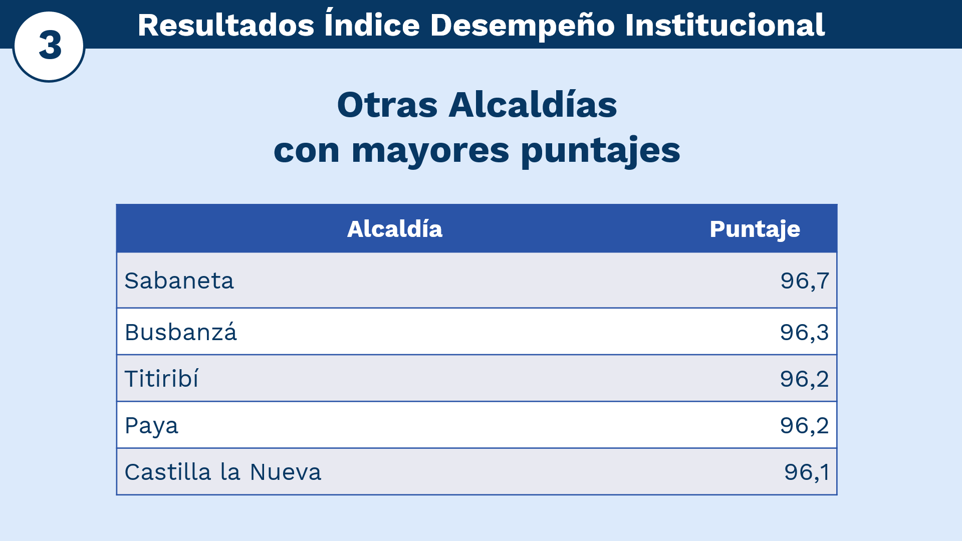También se destacaron en la medición de la gestión y desempeño institucional otras alcaldías municipales como Sabaneta, Busbanzá, Titiribí, Paya y Castilla la Nueva: