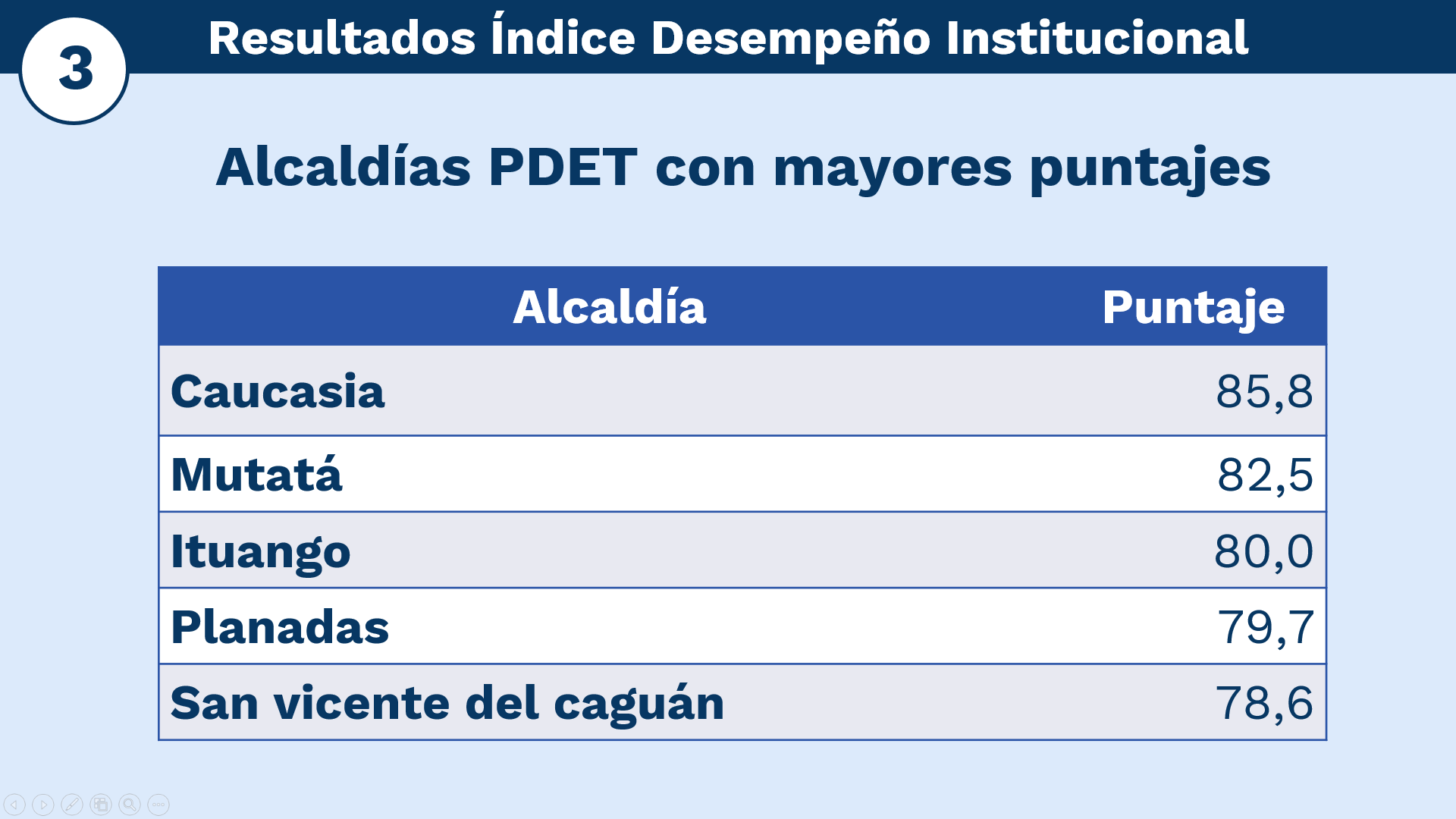 El balance presentado por Función Pública también incorporó un capítulo especial para los municipios que hacen parte del Programa de Desarrollo con Enfoque Territorial (PDET), estrategia liderada por el Gobierno Nacional para la transformación de 170 municipios más afectados por la violencia.