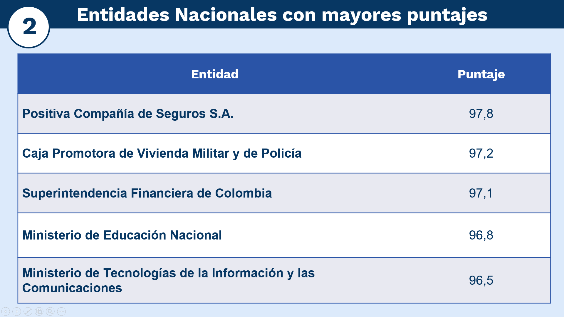 “Quiero destacar los resultados sobresalientes. Mientras más alto es el puntaje, mayor es el desafío para mantenerse. Por eso, un reconocimiento a Positiva Compañía de Seguros, Caja Honor, la Superintendencia Financiera, el Ministerio de Educación Nacional y el Ministerio de Tecnologías de la Información y las Comunicaciones”, agregó el director Fernando Grillo. (Ver cuadro)