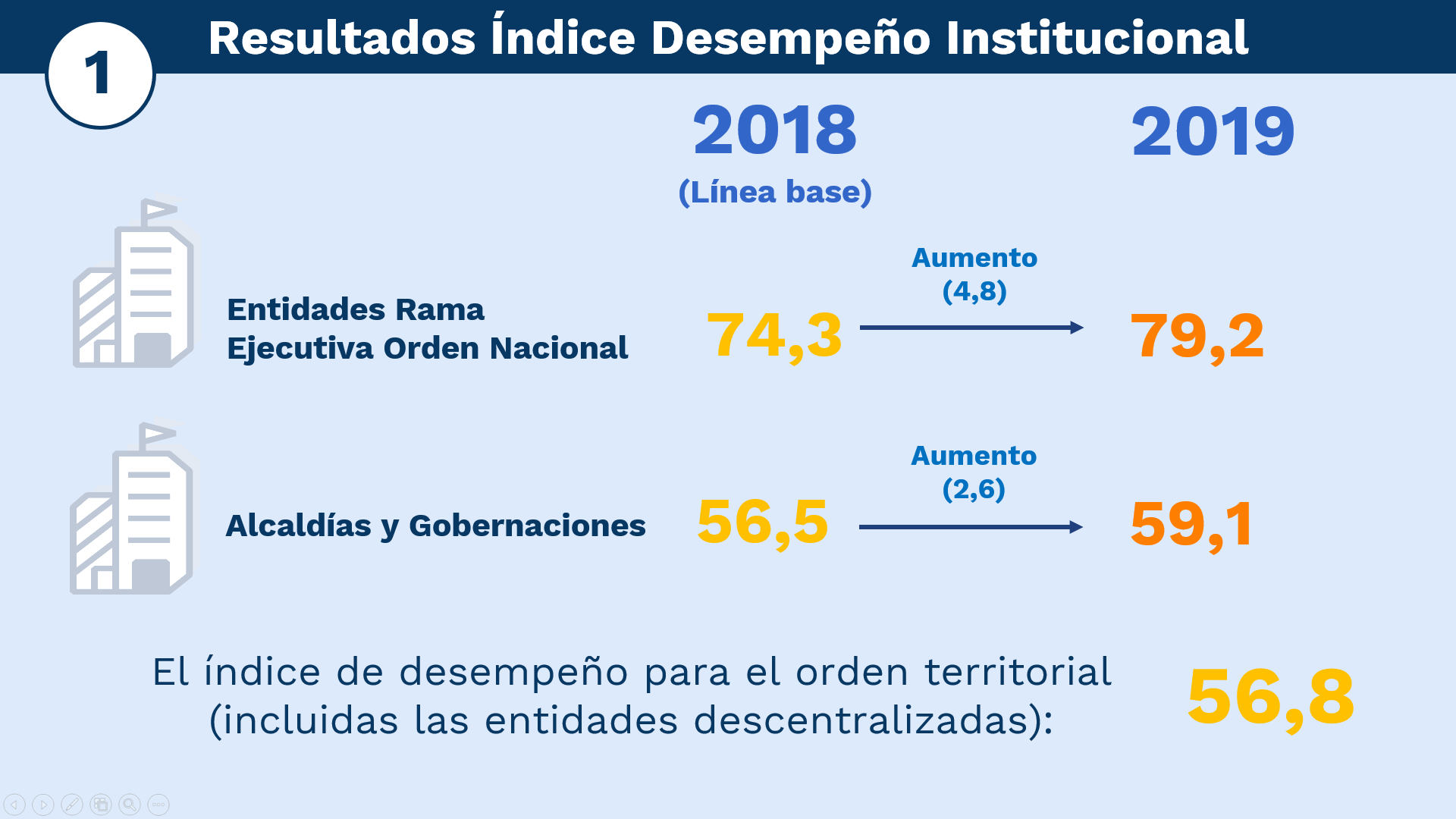 Los avances de las entidades nacionales durante 2019 fueron de 4.8 puntos en el Índice de Desempeño Institucional (IDI) y pasaron de un resultado de 74.3 puntos a 79,2 puntos. Lo anterior significa una mejora en la gestión de las entidades. En los resultados del índice de desempeño institucional se hizo un balance del buen desempeño en la gestión de algunas entidades que sobresalieron en sus puntajes, así como aquellas entidades que demostraron el mayor esfuerzo en su gestión 2019.