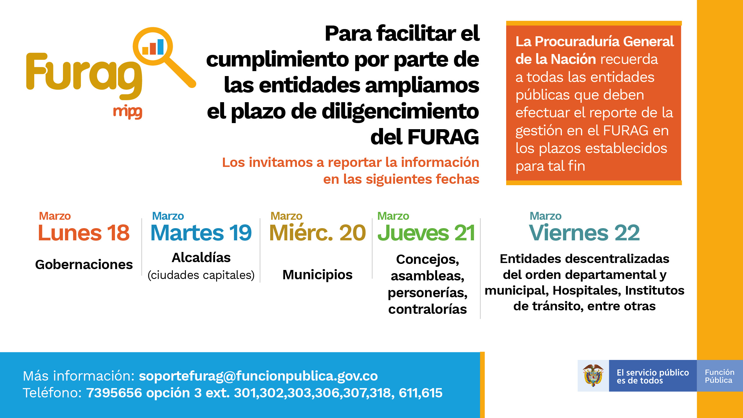 Para mayor información, las entidades y servidores públicos podrán enviar sus inquietudes al correo electrónico soportefurag@funcionpublica.gov.co; acceder al chat virtual de EVA, y comunicarse al PBX 7395656, extensiones 301, 302, 303, 306, 307, 318, 611, 615, 616, 617 y 622, ó al 5610397.