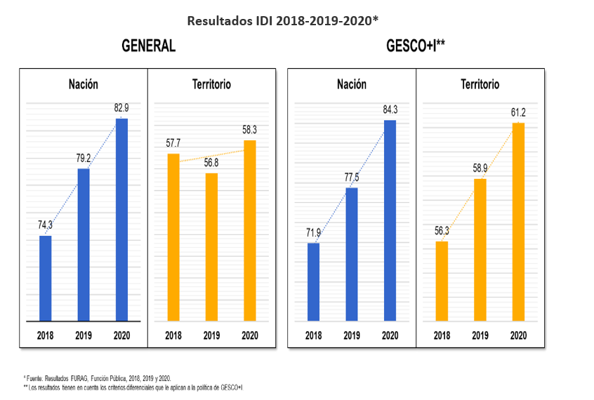 De acuerdo con Función Pública, la política de gestión del conocimiento en la última vigencia, 2020, evaluada en el Índice de Desempeño Institucional (IDI), se posicionó como la primera dimensión a nivel nacional, con un puntaje de 84,2 y la segunda política de las 18 que integran el Modelo Integrado de Planeación y Gestión (MIPG), con un puntaje de 84,3.