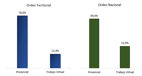 Entre tanto, para el orden territorial, el 78,6% retornaron de forma presencial a sus actividades laborales y el 21,4% están utilizando una de las modalidades del trabajo virtual como se logra apreciar en el siguiente gráfico.
