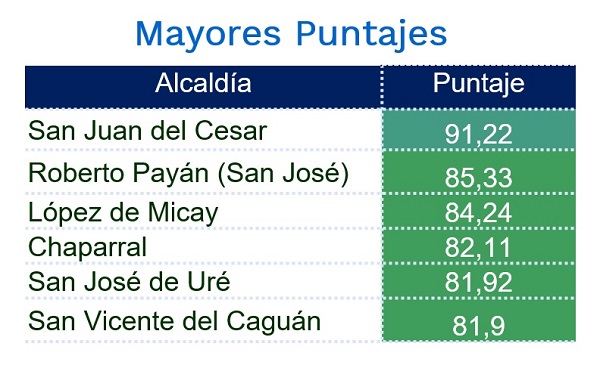 Los municipios con los mayores puntajes en El Índice de Desempeño Institucional (IDI) vigencia 2020 fueron San Juan del Cesar (La Guajira); Roberto Payán (Nariño); López de Micay (Cauca); Chaparral (Tolima); San José de Uré (Córdoba) y San Vicente del Caguán (Caquetá).