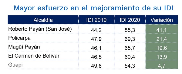Entre tanto, las alcaldías de los municipios PDET con los mayores esfuerzos para aumentar su puntaje en el IDI fueron Roberto Payán (Nariño); Policarpa (Nariño); Magüí (Nariño); El Carmen de Bolívar (Bolívar) y Guapi (Cauca)