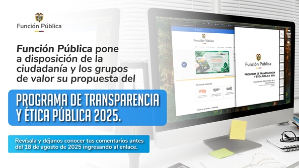 Conozca el programa de Transparencia y ética publica del Departamento Administrativo de la Función Publica, si tiene algún comentario, consulta o sugerencia, puede hacerla a través del formulario de consulta del programa de Transparencia y ética publica