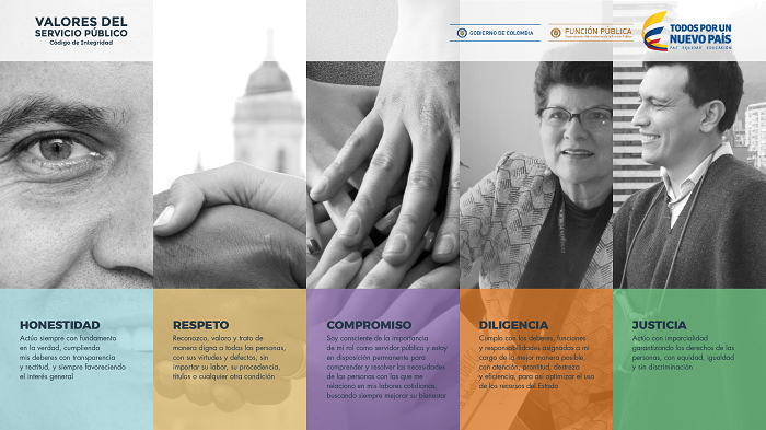 Este Código reúne 5 valores: la Honestidad, el Respeto, el Compromiso, la Diligencia y la Justicia, los cuales, cabe destacar, fueron seleccionados por casi 25 mil servidores públicos del país mediante mecanismos como buzones dispuestos en ministerios y departamentos administrativos, así como a través de un formulario de votación virtual.