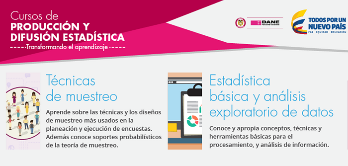 Bogotá, miércoles 28 de junio de 2017. Hasta el próximo 5 de julio ha sido ampliado el plazo de inscripción a los Cursos de Producción y Difusión Estadística, en Técnicas de Muestreo y Estadística básica y análisis exploratorio de datos del Departamento Administrativo Nacional de Estadística, Dane, los cuales tienen descuentos especiales para servidores públicos en el marco del Programa Servimos.