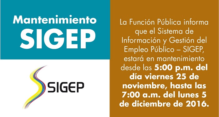 Bogotá, jueves 24 de noviembre de 2016. Función Pública informa que el Sistema de Información y Gestión del Empleo Público – SIGEP estará en mantenimiento entre las 5 p.m. del viernes 25 de noviembre y las 7:00 a.m. del lunes 5 de diciembre.