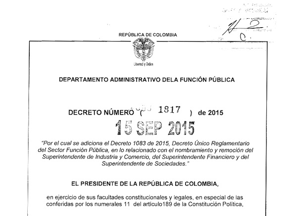 El Gobierno Nacional expidió el Decreto 1817 del 15 de septiembre de 2015 por el cual se adiciona el Decreto 1083 de 2015 o Decreto Único Reglamentario del Sector Función Pública, en lo relacionado con el nombramiento y remoción de los Superintendentes de Industria y Comercio, Financiero y de Sociedades.