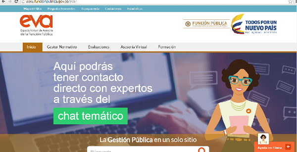 Eva contestará las preguntas de los usuarios, de lunes a viernes, en los horarios de 8:00 am a 12:00 pm y de 2:00 pm a 5:00 pm. Ustedes pueden participar ingresando a www.funcionpublica.gov.co/eva.