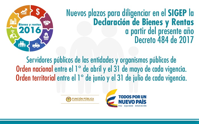 Bogotá, martes 28 de marzo de 2017. A partir de la fecha, el plazo para el diligenciamiento de la declaración de bienes y rentas de los servidores del Estado fue modificado. Los servidores públicos de las entidades y organismos del orden nacional tendrán que hacerlo entre el 1° de abril y el 31 de mayo de cada vigencia; mientras que los servidores públicos del orden territorial lo harán entre el 1° de junio y el 31 de julio de cada vigencia.