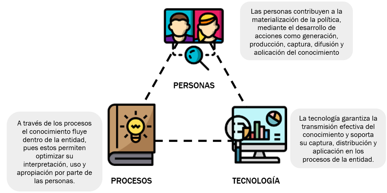 Del mismo modo, la adecuada implementación de la política requiere de ciertas condiciones habilitantes para el buen desarrollo de la gestión del conocimiento y la innovación, estos elementos se entienden en el marco de la política como la triada de la gestión del conocimiento, según esta se presenta a continuación: