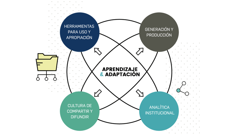Los ejes de la gestión del conocimiento y la innovación contemplan los escenarios en los que opera el doble ciclo de gestión del conocimiento. Los ejes cuentan con acciones que permiten fortalecer el desempeño institucional que lleve a potenciar el cumplimiento del propósito fundamental de la entidad.