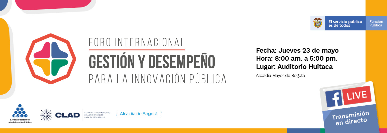 Ahora bien, con el objetivo de contribuir con una administración pública innovadora en el país y compartir los logros más significativos en materia de gestión pública, el Departamento Administrativo de la Función Pública, la Secretaría General de la Alcaldía de Bogotá, la Escuela Superior de Administración Pública y el Centro Latinoamericano de Administración para el Desarrollo realizarán el Foro Internacional de Gestión y Desempeño para la Innovación Pública. Este Foro se desarrollará bajo las siguientes temáticas: 1) Innovación en la Administración Pública, 2) Transparencia, participación y servicio al ciudadano y 3) Control interno en la lucha contra la corrupción.