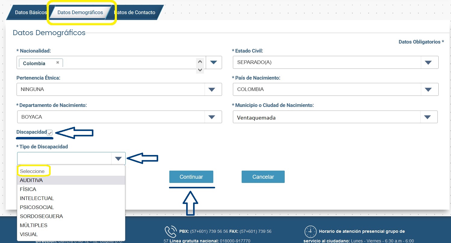 Dé clic en el botón "Datos Demográficos", luego marque la casilla de verificación "Discapacidad", en "Tipo de Discapacidad" debe dar clic para desplegar las categorías de discapacidad y escoja una, luego dar clic en el icono "Continuar".