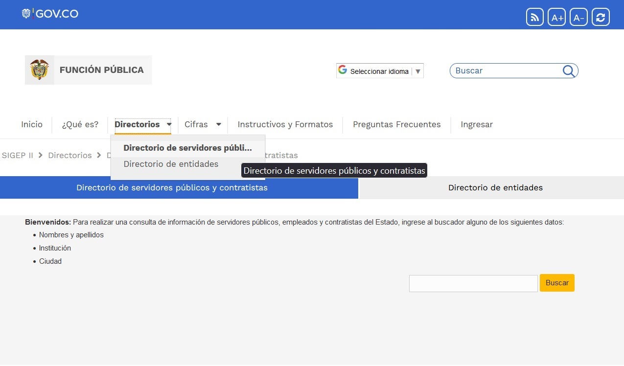 Ingrese a la página web www.sigep.gov.co haga clic en el enlace denominado “Directorio de servidores públicos y contratistas” ubicado en la parte superior izquierda de la pantalla.