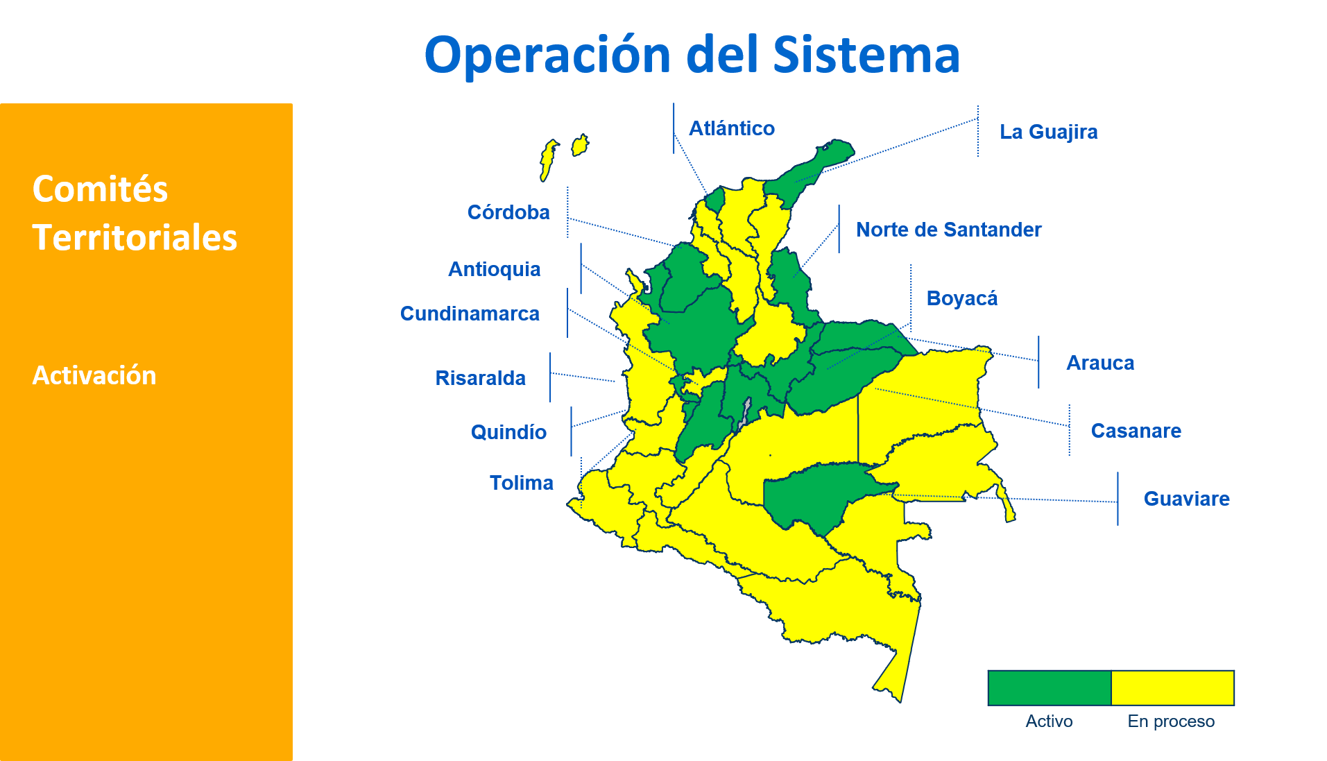 Los comités territoriales son las instancias que coordinan y operan el Sistema en cada uno de los departamentos y apoyan la puesta en marcha de los nodos del Sistema.