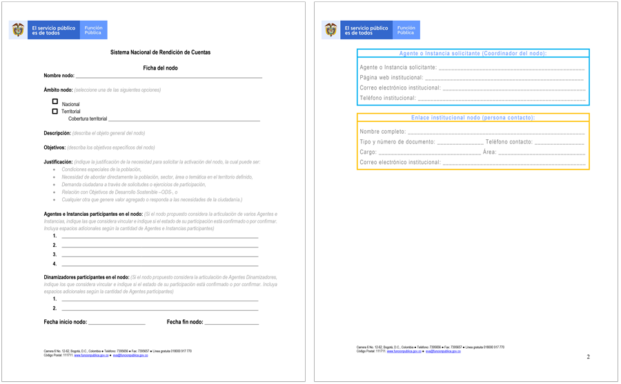 Los nodos son puntos de intersección y conexión de diferentes actores, entidades públicas, instancias de coordinación y sistemas, que confluyen para rendir cuentas que respondan a las necesidades ciudadanas e institucionales. Los nodos permiten articular ejercicios de rendición de cuentas que sean de interés de la población y estén de acuerdo con la realidad del territorio y las necesidades y particularidades de los grupos de valor