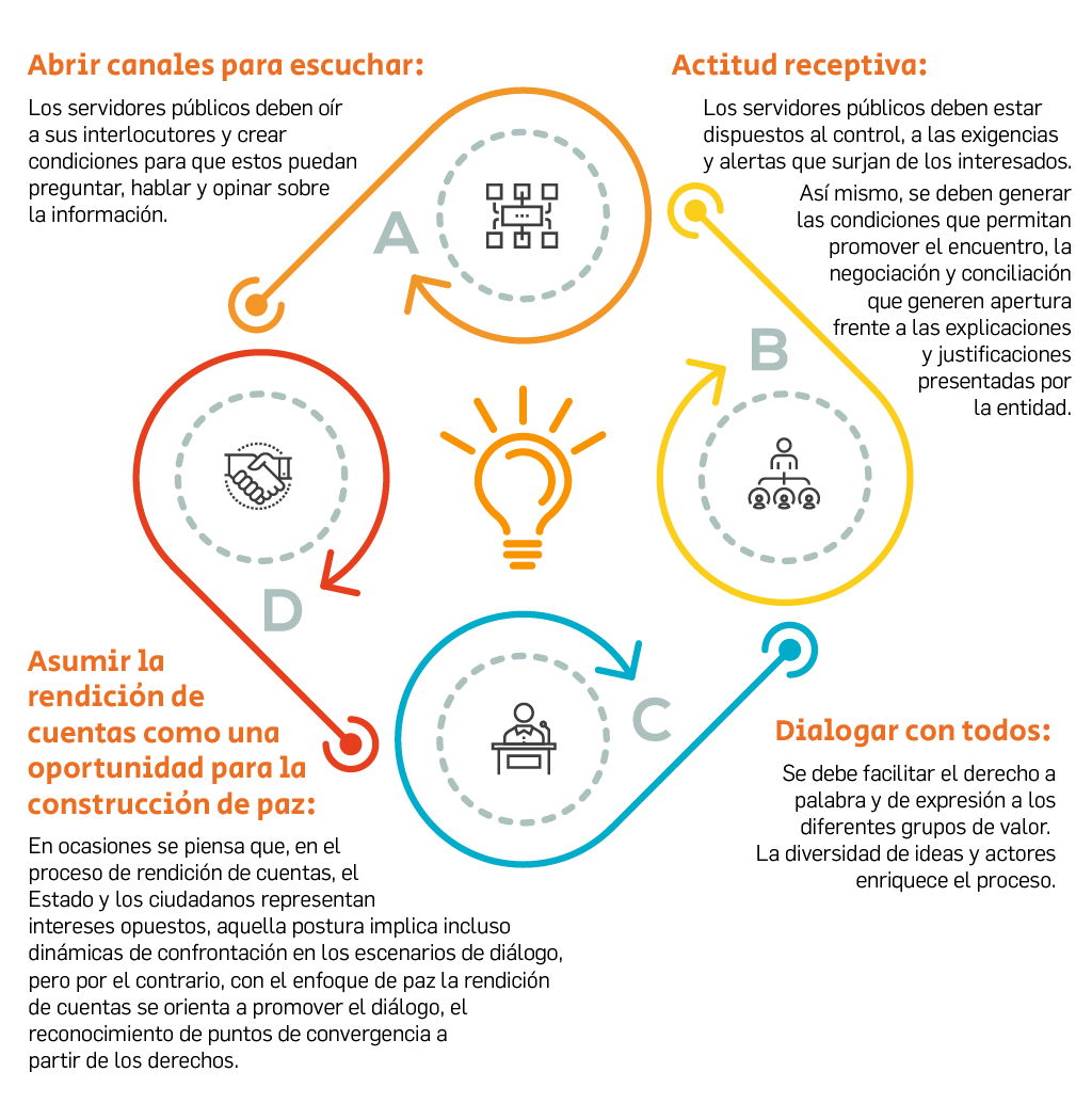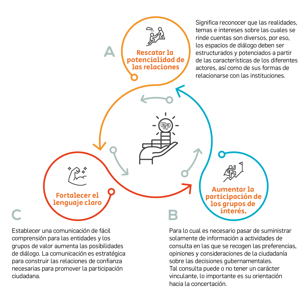 La rendición de cuentas supone responder y someterse a diversos tipos de control, en especial al control ciudadano; sin participación no hay rendición de cuentas, por lo tanto, el diálogo es un elemento fundamental. La forma de interactuar y dialogar con los grupos de interés es decisiva, a continuación, algunos elementos claves: