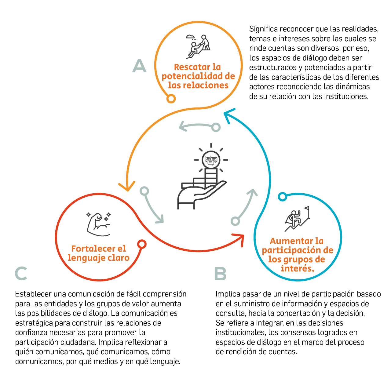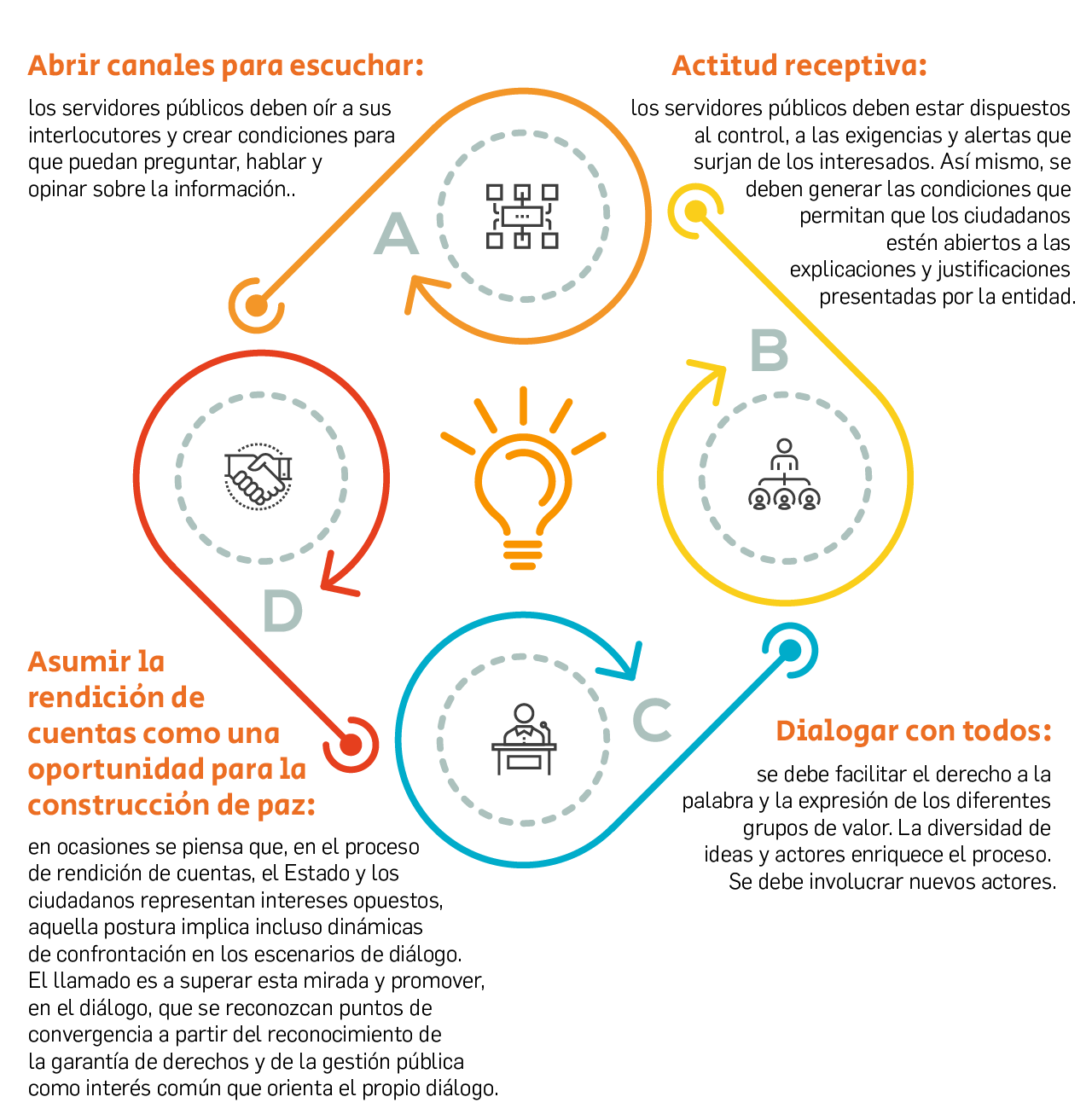 La rendición de cuentas supone responder y someterse a diversos tipos de control, en especial al control ciudadano; sin participación no hay rendición de cuentas, por lo tanto, el diálogo es un elemento fundamental. La forma de interactuar y dialogar con los grupos de interés es decisiva, a continuación, algunos elementos claves:
