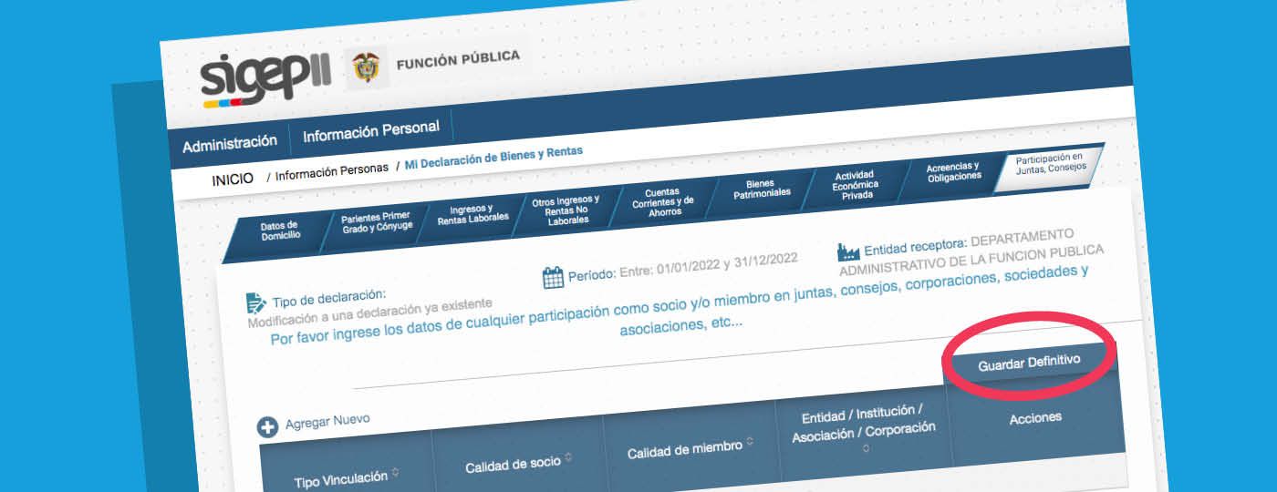 La Declaración de Bienes y Rentas es una obligación de todos los servidores públicos de entidades y organismos públicos, se realiza en el SIGEP y contiene información detallada de ingresos, cuentas bancarias, bienes patrimoniales, acreencias y obligaciones y participación en juntas, consejos directivos, corporaciones, sociedades o en cualquier organización o actividad privada de carácter económico o sin ánimo de lucro dentro o fuera del país y solo podrá ser utilizada para los fines y propósitos de la aplicación de las normas del servicio público.